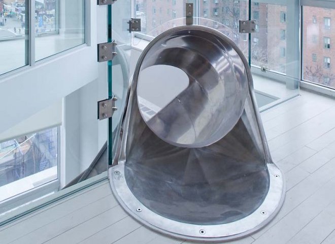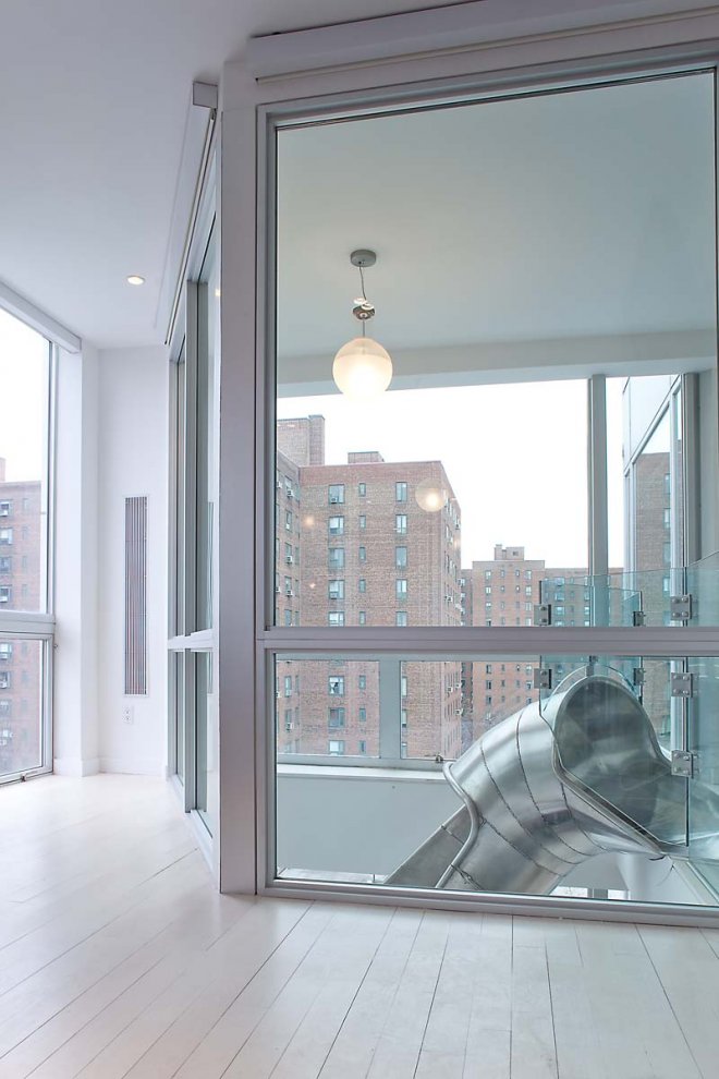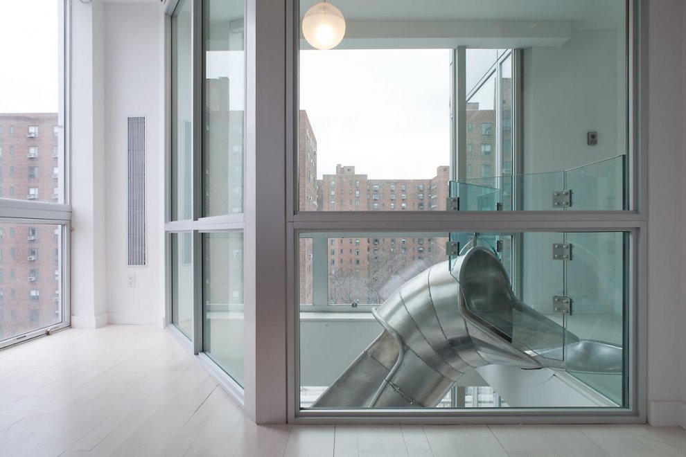 Cet appartement duplex est situé dans un nouveau bâtiment dans le East Village de New York. Les deux appartements sont regroupés par un escalier ainsi qu’un toboggan fabriqué à partir d’un demi-tube en acier inoxydable pour pouvoir glisser du dernier étage près du bureau jusqu’à la salle a manger… la grande classe 🙂